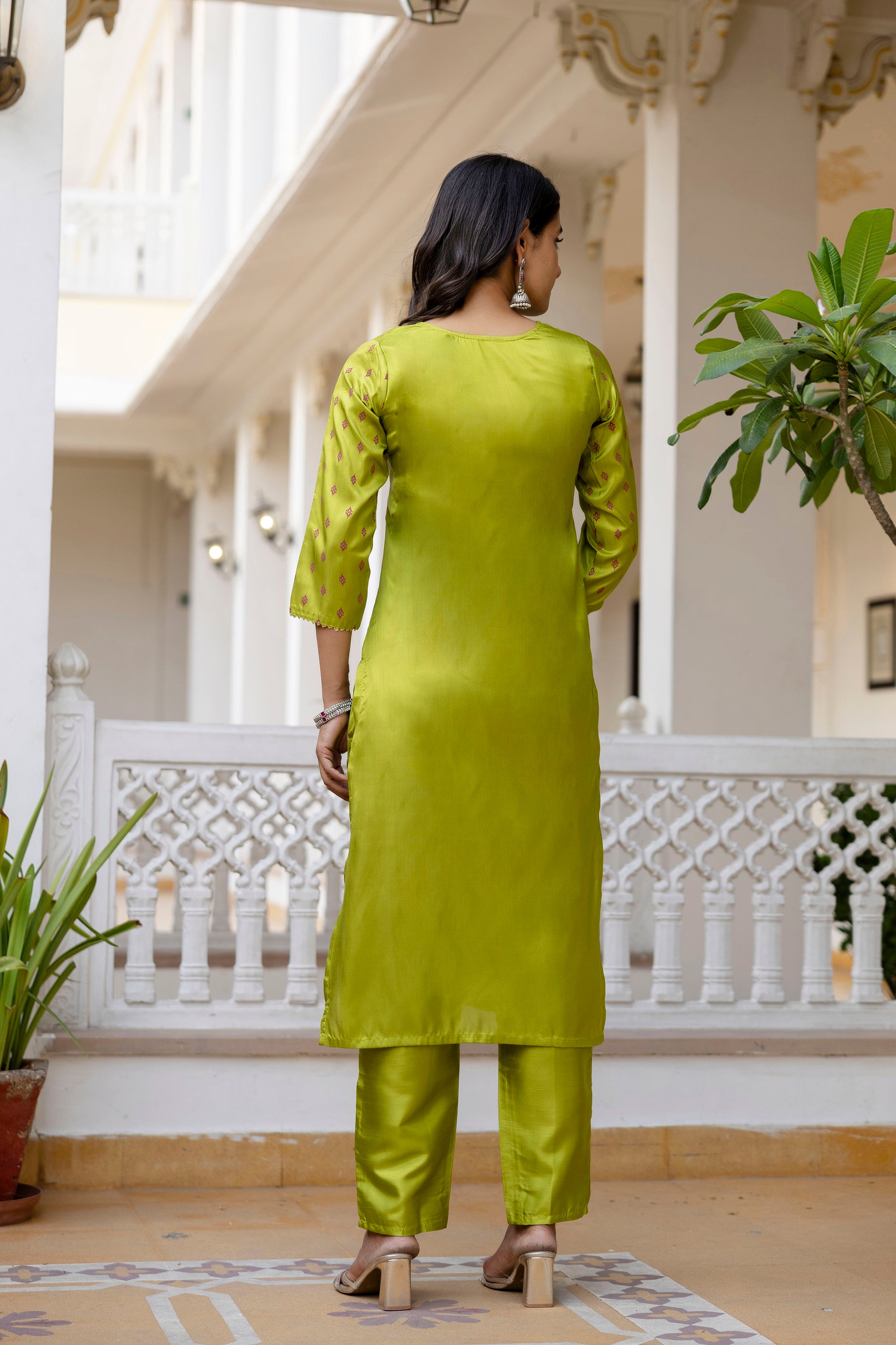 Festive Glow Outfit in Lime Silk with Hot Pink–Orange Chandery Dupatta Flair